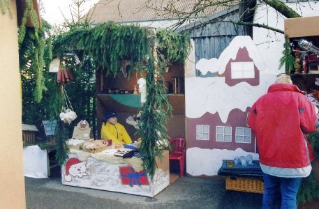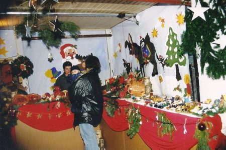Der erste und zweite Weihnachtsmarkt wurde mit Hütten aus Wellpappe gestaltet. Um den Eindruck zu verschönern wurden sie mit Bildern bemalt.